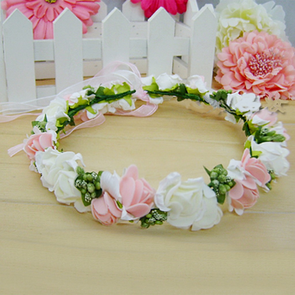 Mahkota Tiara Rangkaian Bunga Pink Putih Daun Untuk Hiasan Rambut
